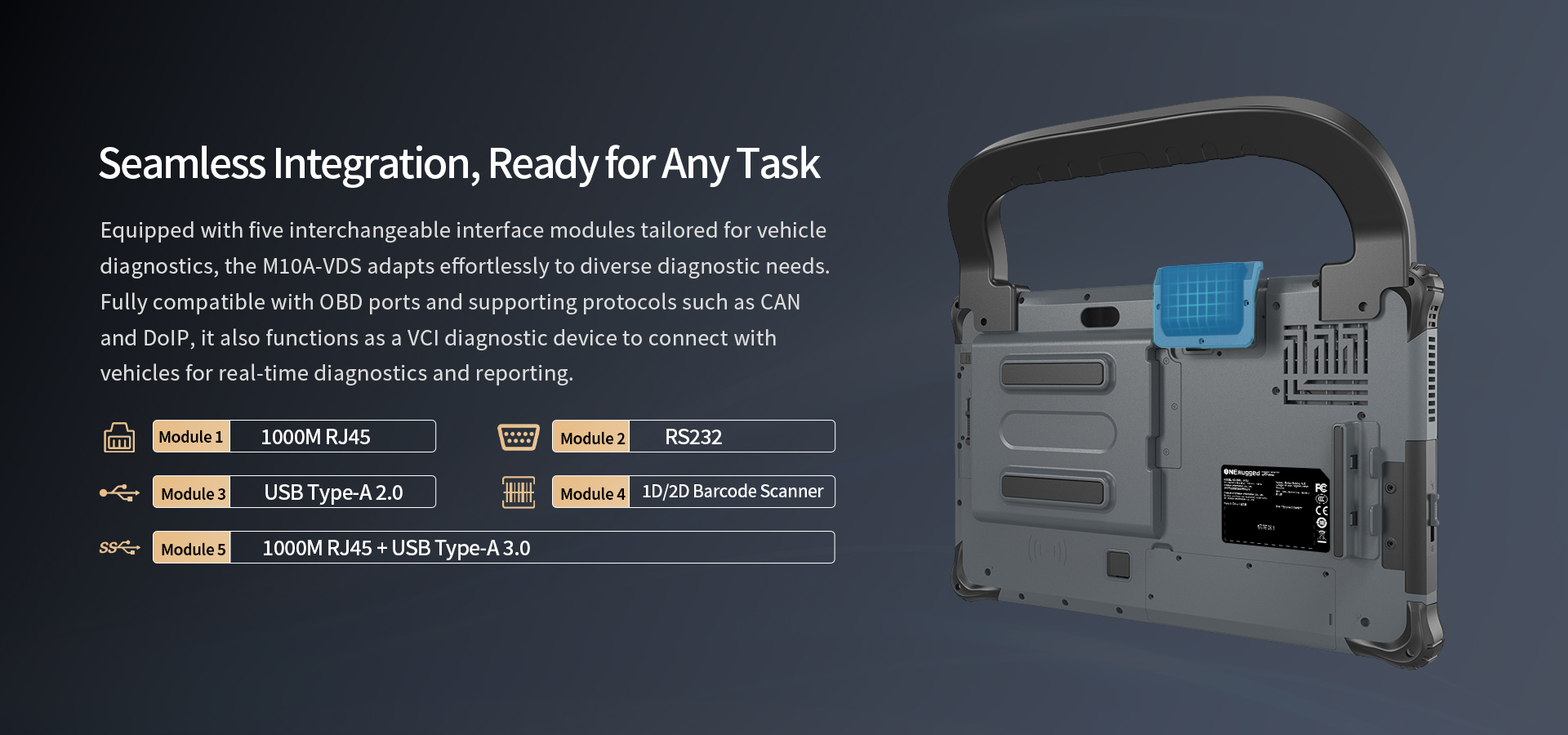 Onerugged M10A-VDS создан для автомобильной диагностики с точностью и мощностью. Испытайте непревзойденную производительность с Intel®Ядро™Процессоры i5/i7, 10,1-дюймовый FHD-дисплей высокой яркости, модульные диагностические интерфейсы и интеллектуальная конструкция ручки, которая упрощает каждый осмотр.